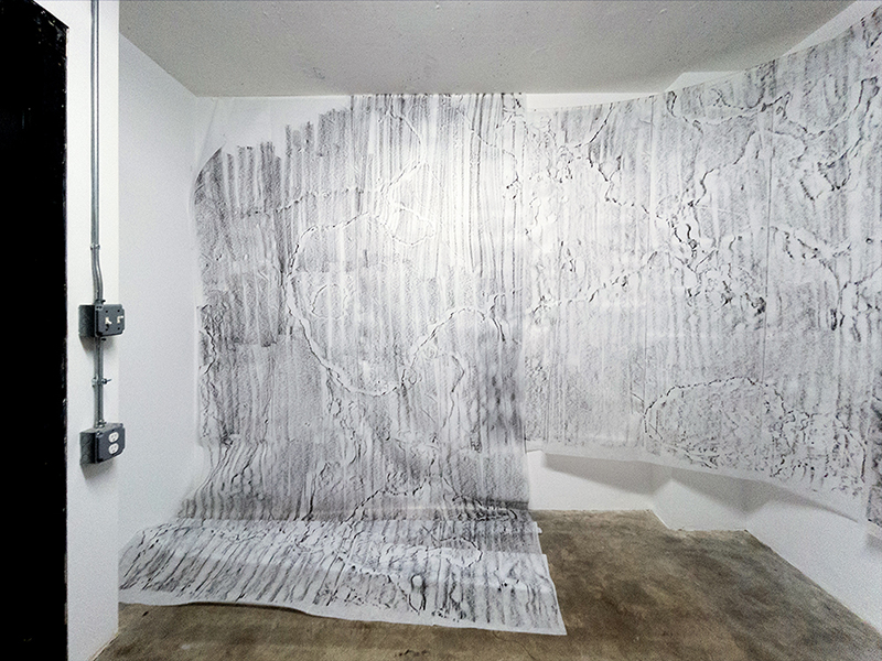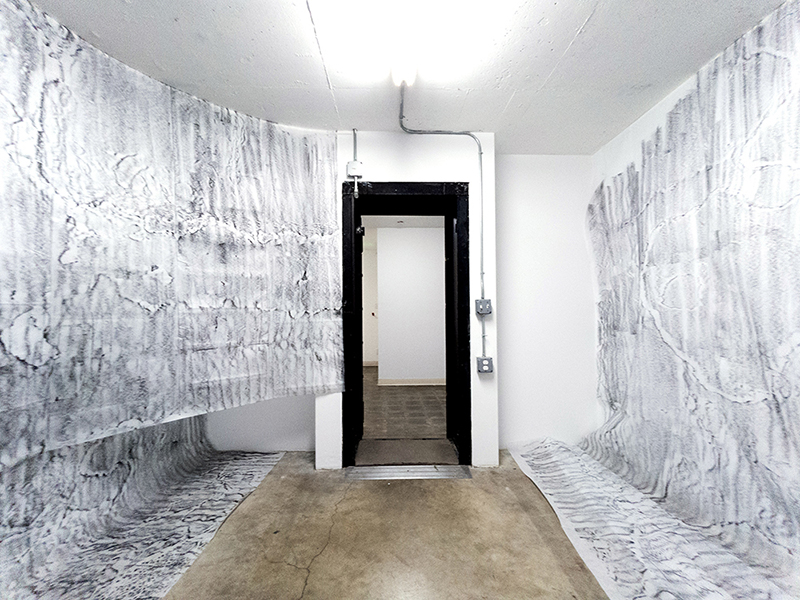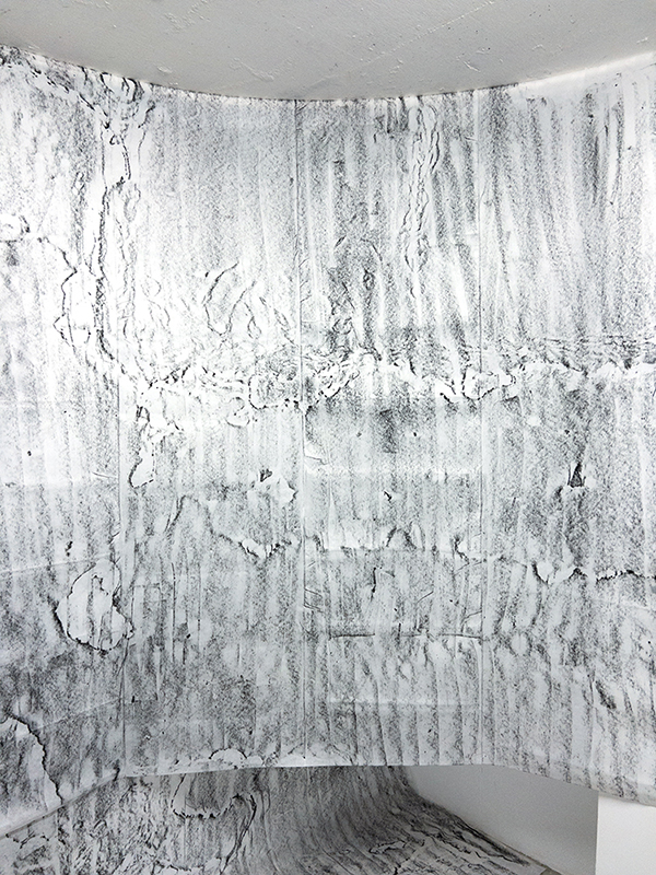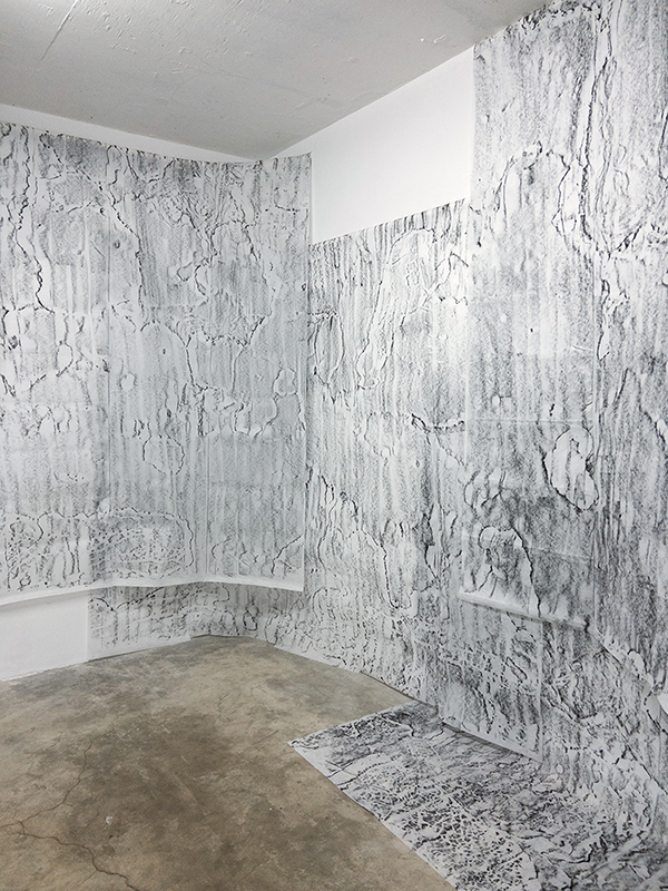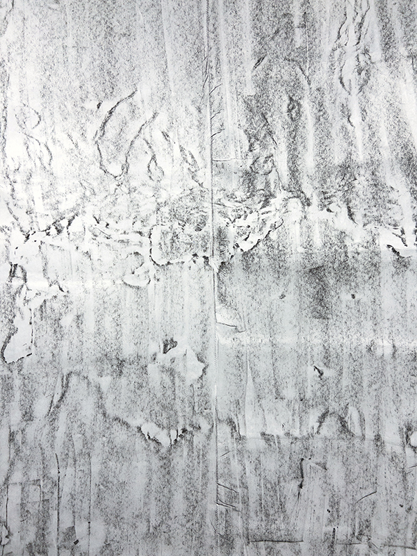 I take rubbings using lithographic rubbing ink and fabric interfacing. It is a vernacular technique used by folks heavy into frottage. I was attracted to this method because it utilizes invisible structural components of two physical languages I speak, sewing and printmaking, to make visible details of structure and surface. The dimensions of a rubbing correspond to the limits of my body - how far I can reach, how long I can crouch, how much I can carry. These dimensions increase exponentially with the support of others.
